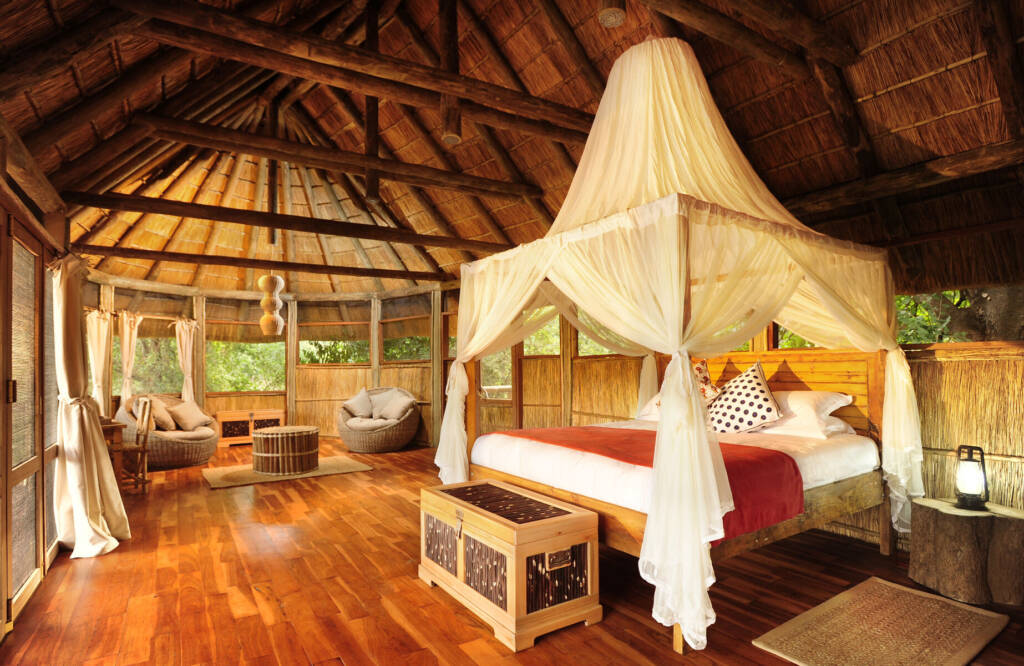 Aquí, las tradiciones de un campamento africano se combinan con la elegancia y el estilo y crean un campamento impresionante que se siente como si hubiera crecido orgánicamente a partir de los alrededores. En el centro se encuentra la zona del salón, a la sombra de un enorme árbol de caoba y con vistas a un pozo de agua. Las cuatro habitaciones con techo de paja están elevadas sobre pilotes. Los ricos interiores de madera hacen eco de los árboles y los muebles están tallados a mano por artesanos locales. Después de un safari temprano en la mañana, regrese a su habitación para disfrutar de una refrescante ducha en cascada al aire libre o continúe con el espectáculo de vida silvestre desde su terraza privada.