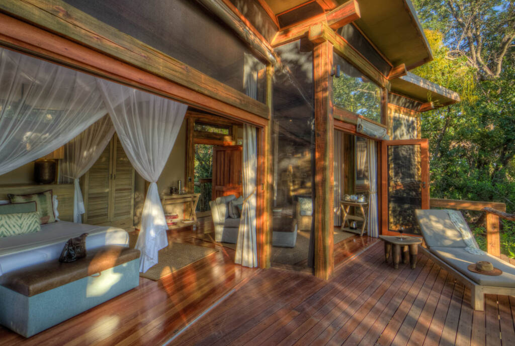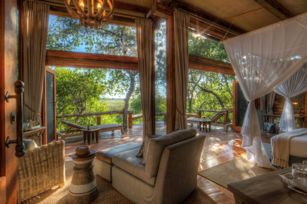 Para garantizar una experiencia de safari pacífica y genuina, Camp Okavango tiene capacidad para solo veinticuatro huéspedes. Hay once íntimas suites Safari y una suite familiar que consta de dos dormitorios y cada uno con un baño en suite. Cada una de las suites para huéspedes se ha construido sobre plataformas de madera elevadas individuales y se encuentra debajo de la espesa vegetación del delta del Okavango. Las puertas corredizas se abren a una plataforma de observación privada al aire libre que ofrece hermosas vistas sobre el delta del Okavango.