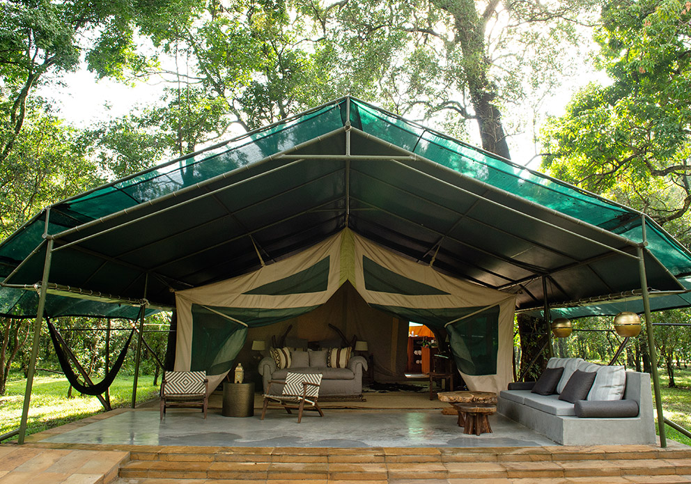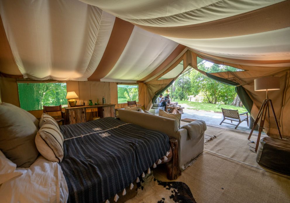 Ocultas bajo árboles centenarios en lo profundo del bosque, hay solo diez tiendas de campaña que bordean las sinuosas orillas del río Mara. Las mesas de madera maciza contrastan con los sofás azules de gran tamaño y un candelabro central con cuentas de colores, mientras que los retratos tribales y los artefactos africanos están repartidos por todas partes. Las comidas se sirven en la plataforma de madera elevada del comedor principal y la carpa comedor que ofrece una vista panorámica de los hipopótamos que resoplan debajo. La característica principal es una hoguera hundida que se enciende por las noches, el lugar perfecto para sentarse con un cóctel de su elección.