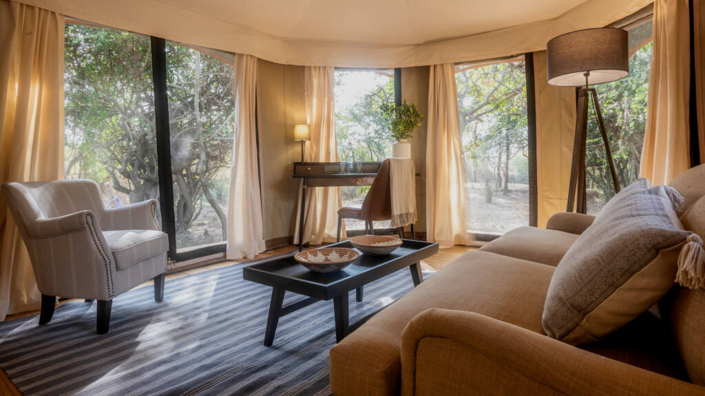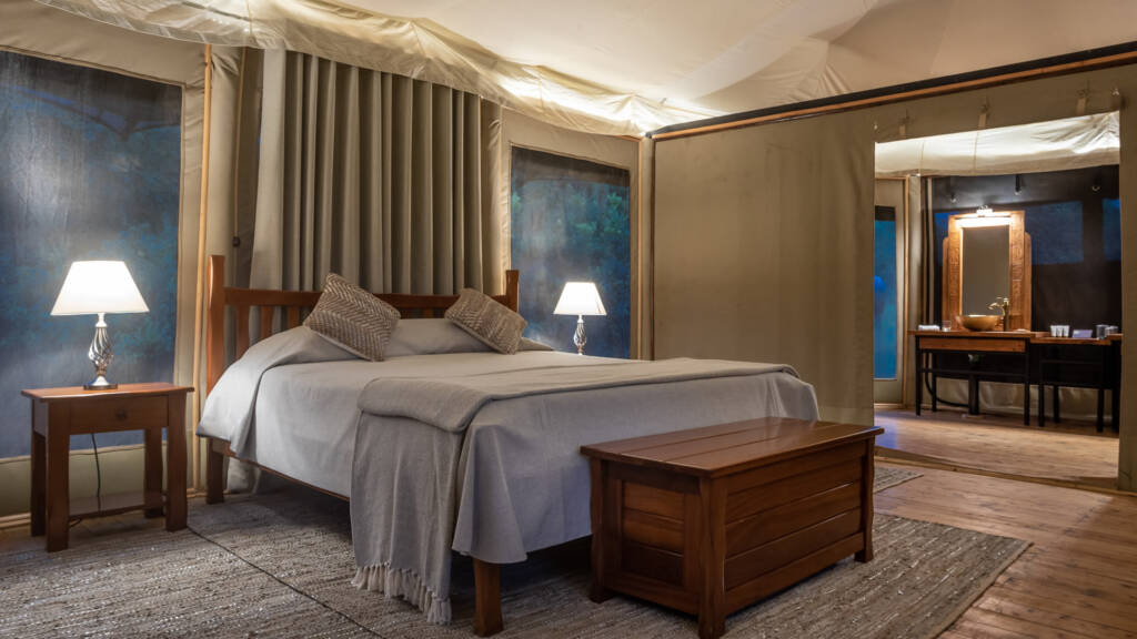 Las espaciosas suites tipo tienda de campaña de Ilkeliani han sido cuidadosamente diseñadas para brindar todos los pequeños lujos que realzan un safari. Cada suite tiene total privacidad, escondida en una arboleda con su propia entrada privada. Levantadas sobre pilotes, cada una ofrece vistas panorámicas del río Talek hacia las llanuras doradas de Masai Mara. Las suites cuentan con amplias terrazas de madera con laterales de lona desmontables y están elegantemente adornadas con telas fluidas, muebles cómodos e iluminación sutil.