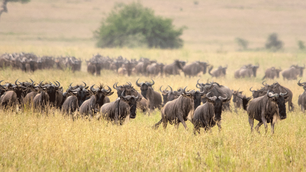 El movimiento constante de columnas de ñus, acompañadas por una multitud de compañeros, sigue una ruta milenaria en busca de pasto y agua. Tras parir en la zona sur del Serengeti, en Tanzania, cerca del Área de Conservación de Ngorongoro, los animales recorren el Serengeti en dirección ascendente y descendente, en el sentido de las agujas del reloj, hacia Masái Mara, en Kenia, antes de regresar a finales de año. En el camino, la emoción es constante, ya que miles de animales son capturados por depredadores y miles más nacen, renovando las poblaciones y manteniendo el ciclo vital.
