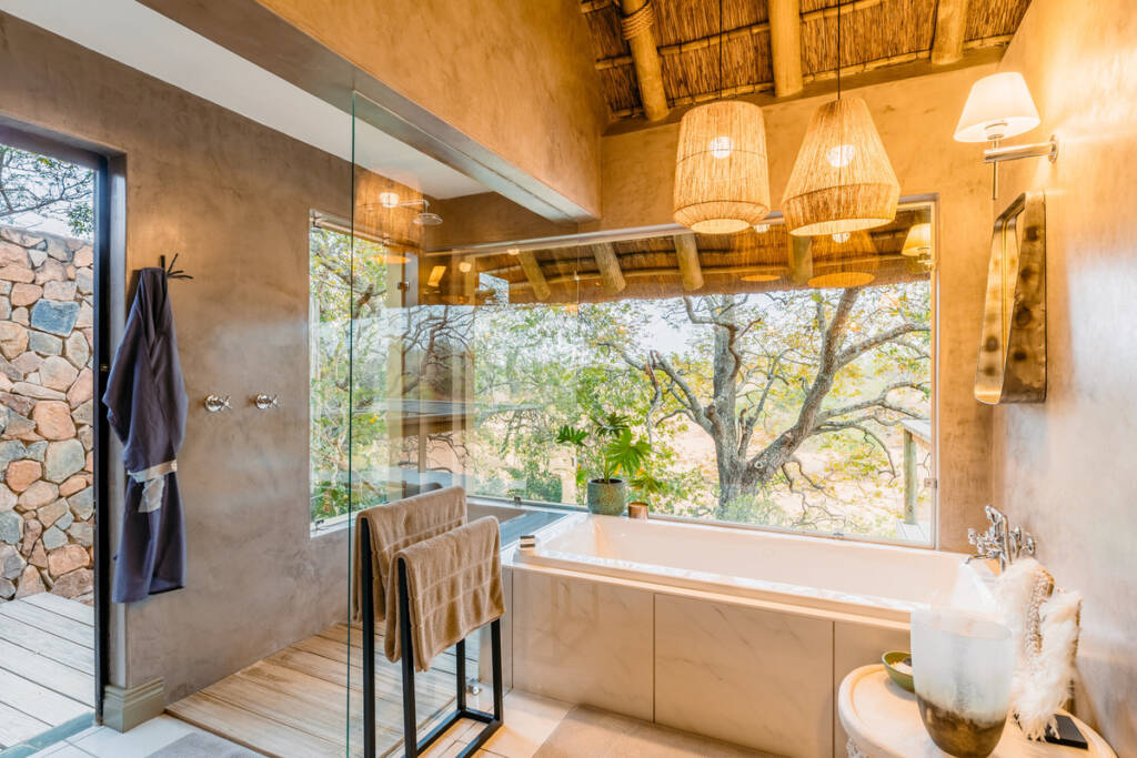 Privadas y elegantes, cada una de las 16 suites de lujo de Game Lodge con todo lo que pueda necesitar, incluidas pantuflas mullidas y una ducha exterior.